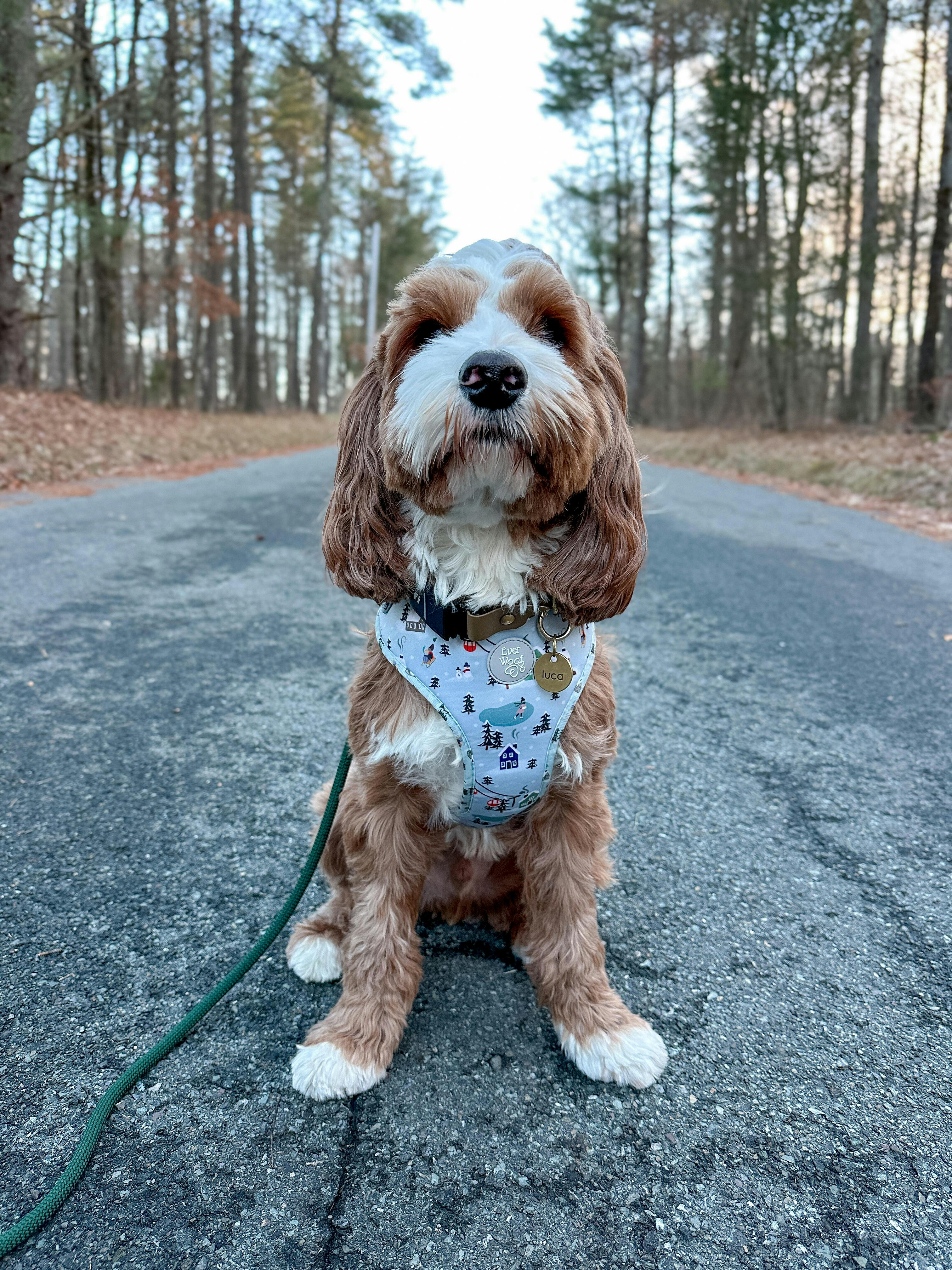 This Harness is made from a custom printed neoprene with breathable lining, along with a fully adjustable polyester webbing on the chest & neck.